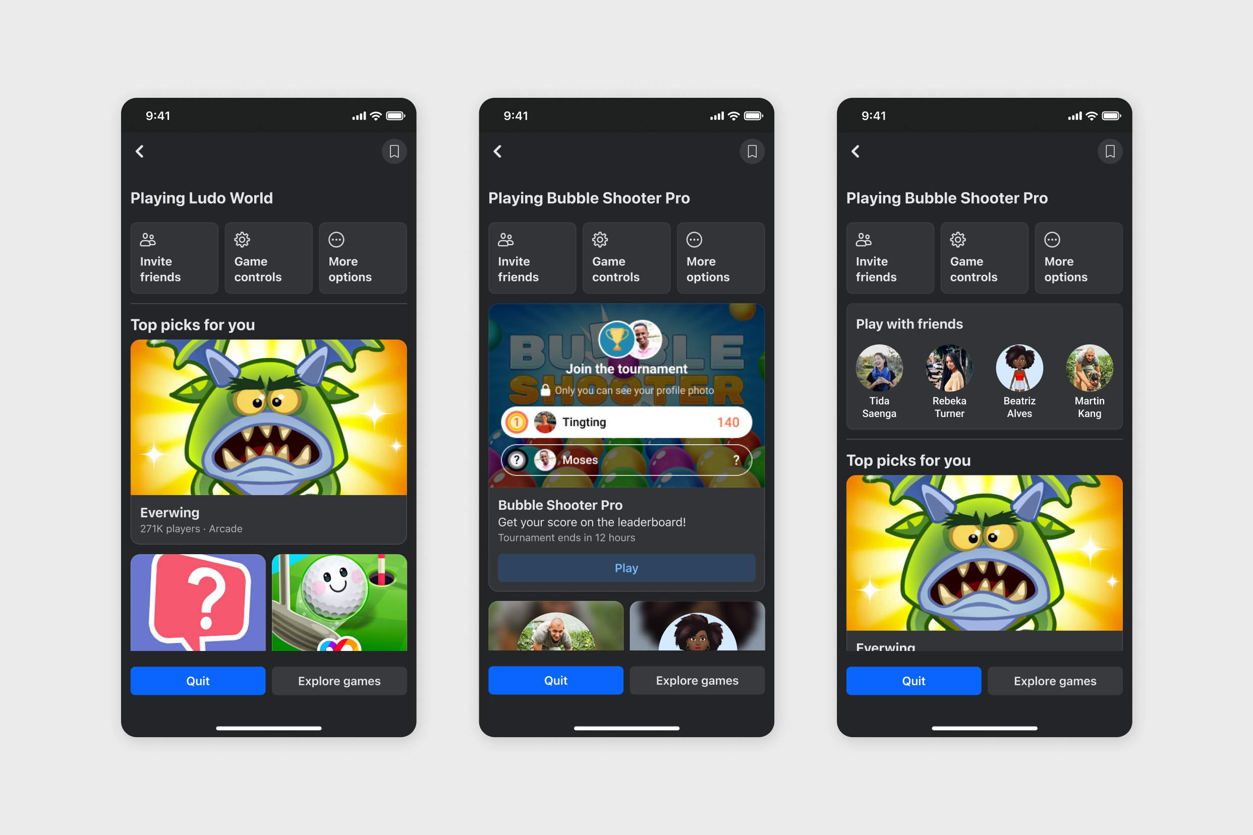 Facebook’s Arcade is a post-play surface that leverages a user’s “clicky” behavior to chain them to new game sessions and social play. Achieved by surfacing personalized game recommendations and top friends.