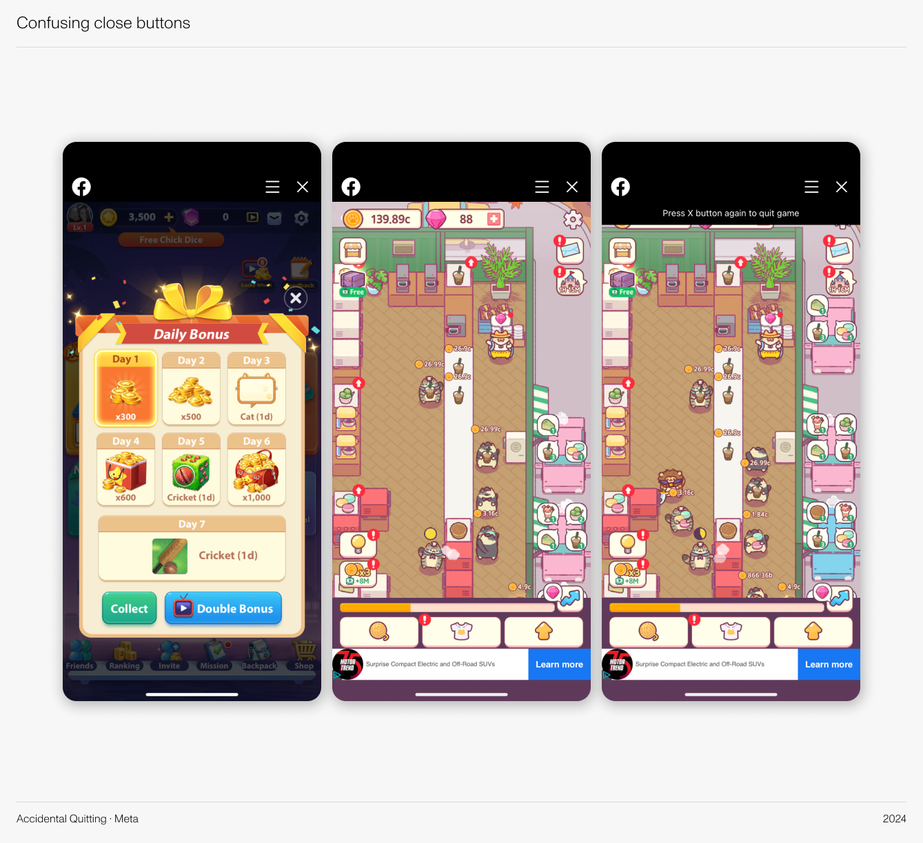 iOS navigation used a button labeled "X" to exit. This led to users mistakenly quitting the game since the game also has X icons. To solve this, we added a double-tap confirmation but isn’t a great user experience.